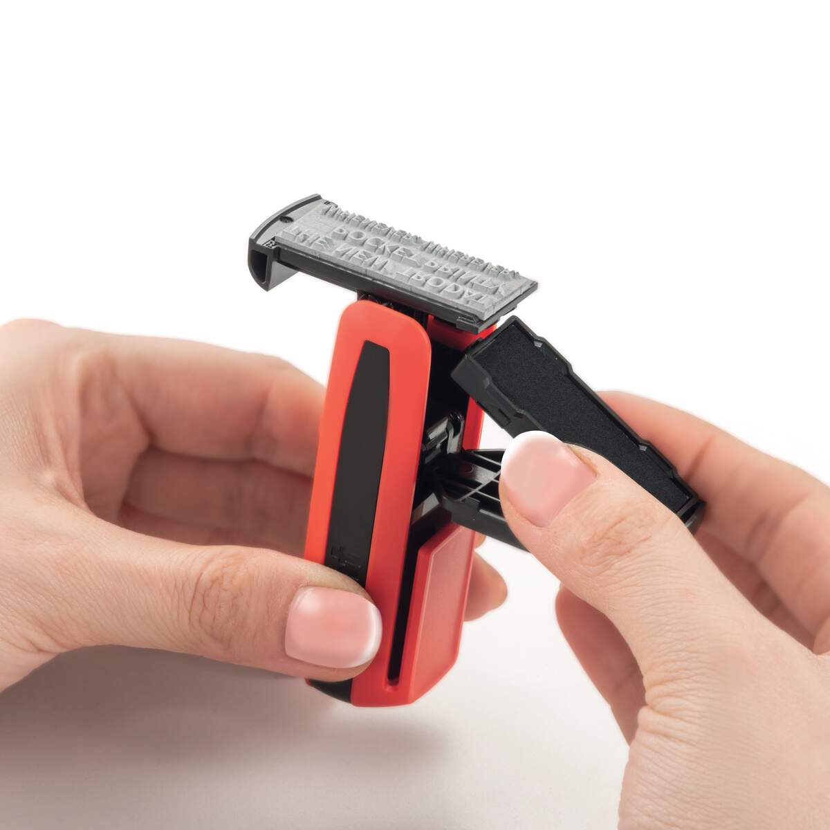 Flick your stamp out like it were a switchblade knife. Quick one-handed operation to make a stunningly crisp and clear impression. Standard ink color is black or uninked for application of your preferred ink. Standard case color combination is red and black. Other case colors may be available (call for details).